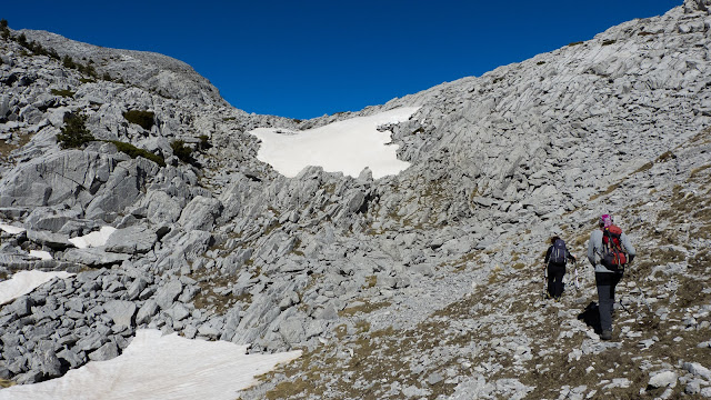 Casi ya cerca del collado donde termina el valle por el que subimos aparecen un par de grandes dolinas y para evitarlas tenemos que dar un buen rodeo y buscar un "camino".